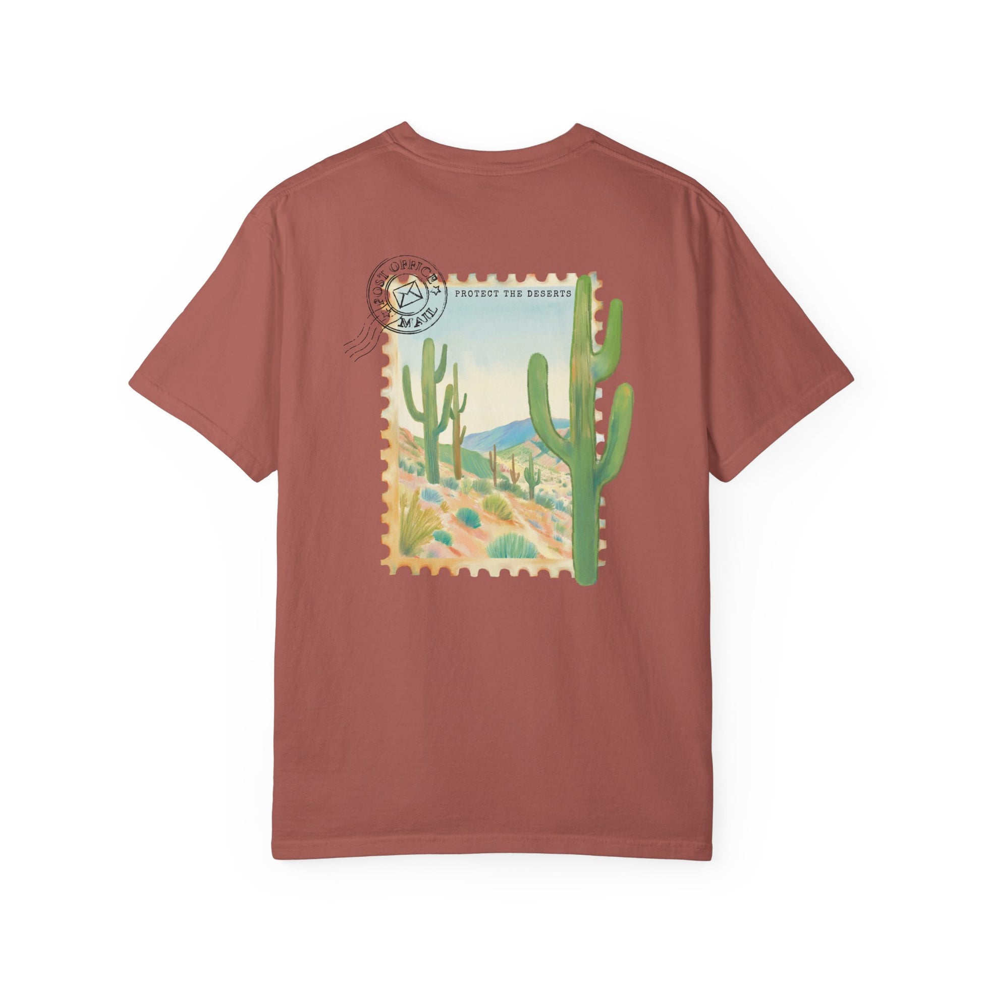 A unisex garment-dyed T-shirt featuring a postage stamp design that says Protect the deserts. This T-shirt is perfect for those who are passionate about desert conservation and want to make a statement with their clothing. It is ideal for casual wear and can be worn by adults during outdoor activities or everyday outings. This T-shirt is relevant for Earth Day, environmental awareness events, and desert conservation campaigns.