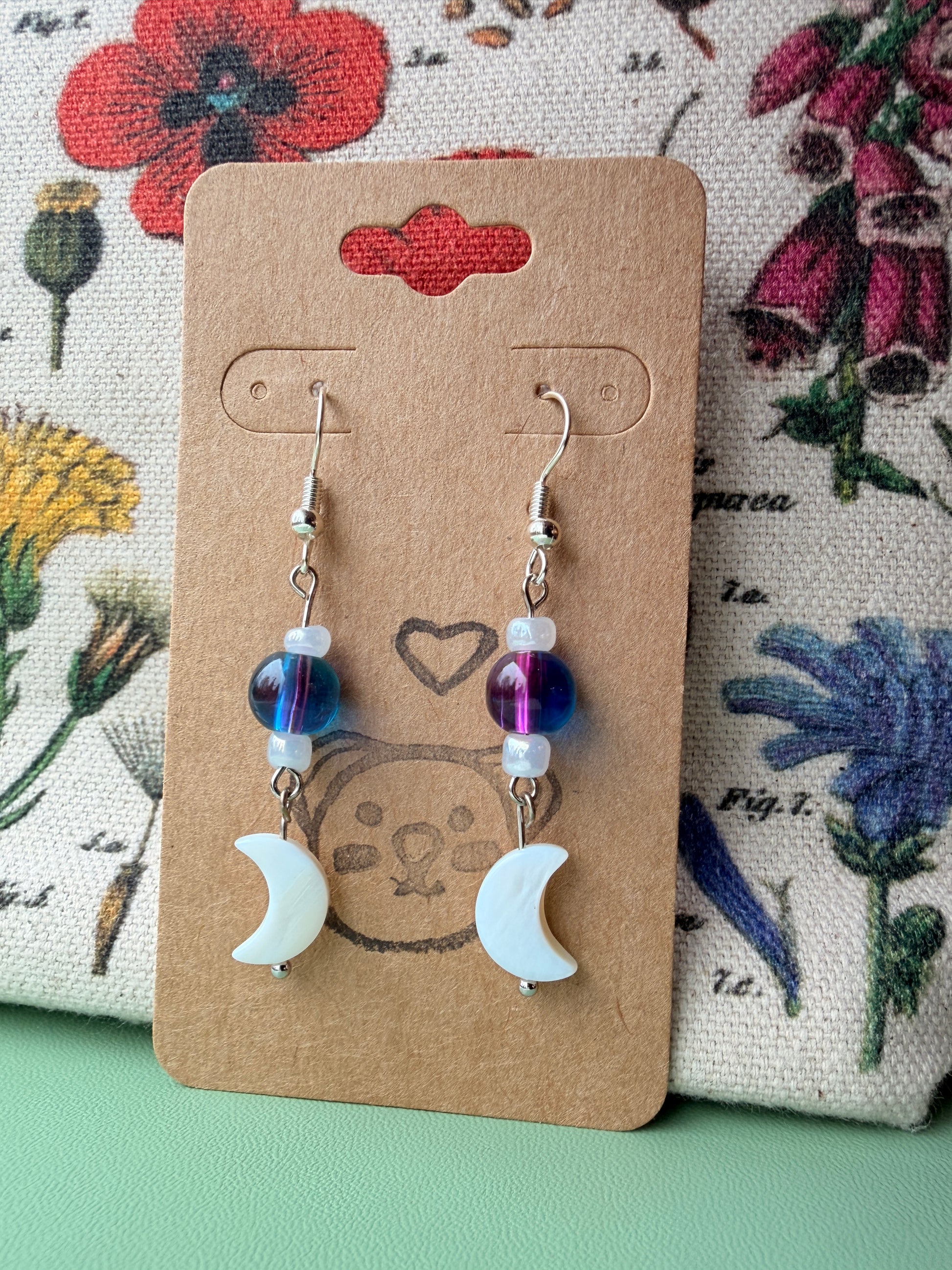 These dreamy celestial earrings feature glowing crescent moon charms paired with iridescent glass beads that shift between deep blue and violet tones in the light. Soft milky accent beads add a gentle, ethereal touch, creating the perfect balance of mystical and sweet.